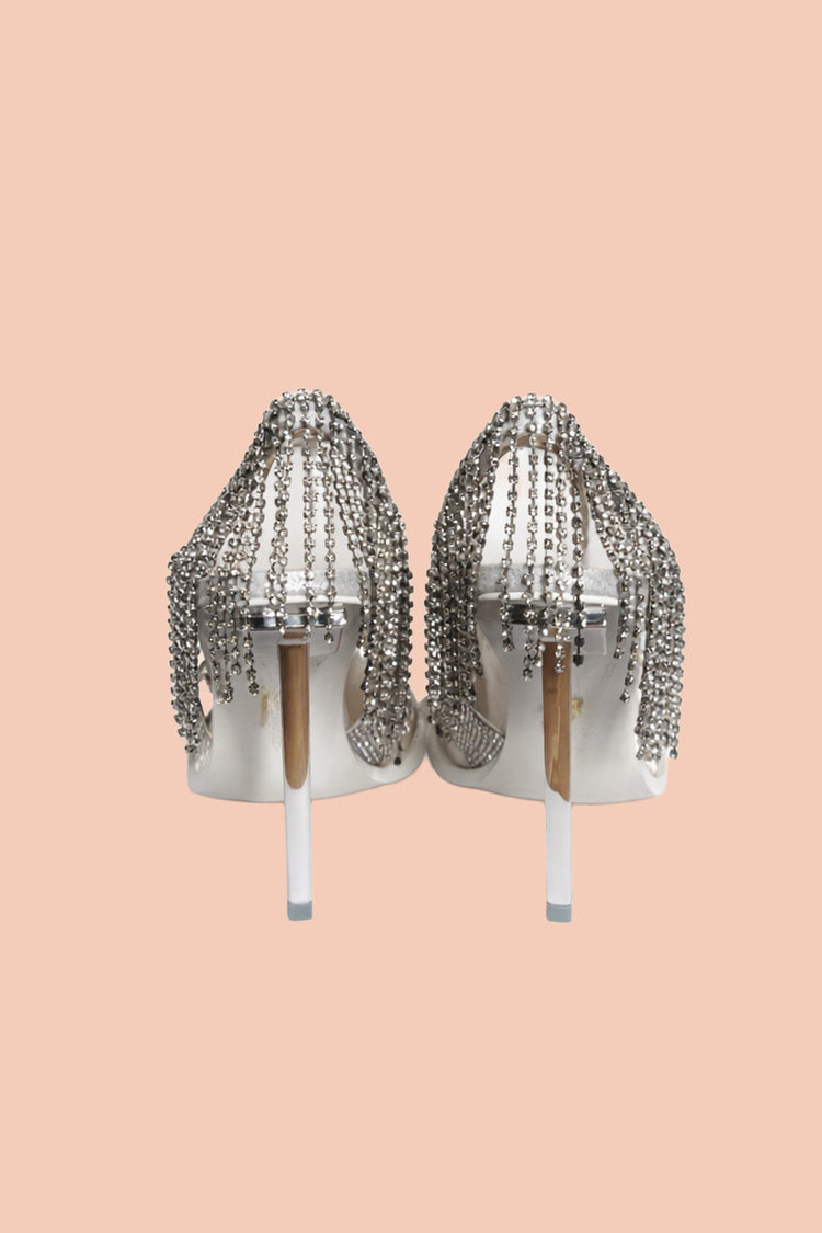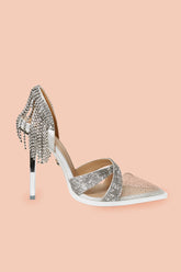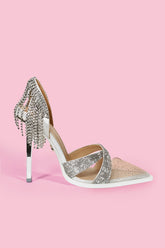 Meet “Silver Spur”... a rhinestone cowgirl moment with peppering of panache. Inspired by our most-loved limited edition Barbara silhouette, Silver Spur pairs a sleek stiletto with thoughtful, light-catching detail. A clear toe box is delicately stardusted with baby rhinestones, and a rhinestone chain at the back heel …for that touch of Western romance.